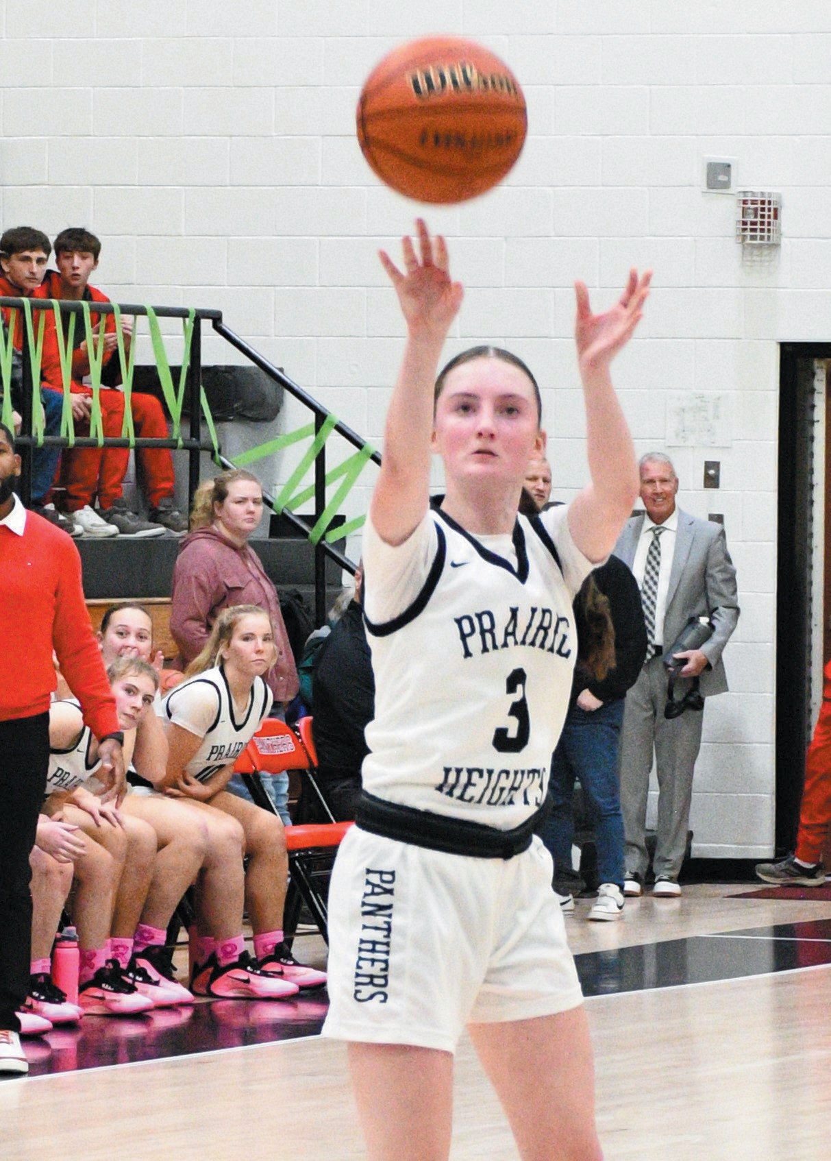 FINDING THE RANGE—Bailee Godsey of Prairie Heights connects on one of her six, three-point baskets against West Noble last Tuesday. Godsey finished with a team-high 21 points, but it wasn’t enough to keep the Lady Panthers from falling, 58-53 in overtime to their NECC rival. (Standard-News Photo by Jeff Miller)