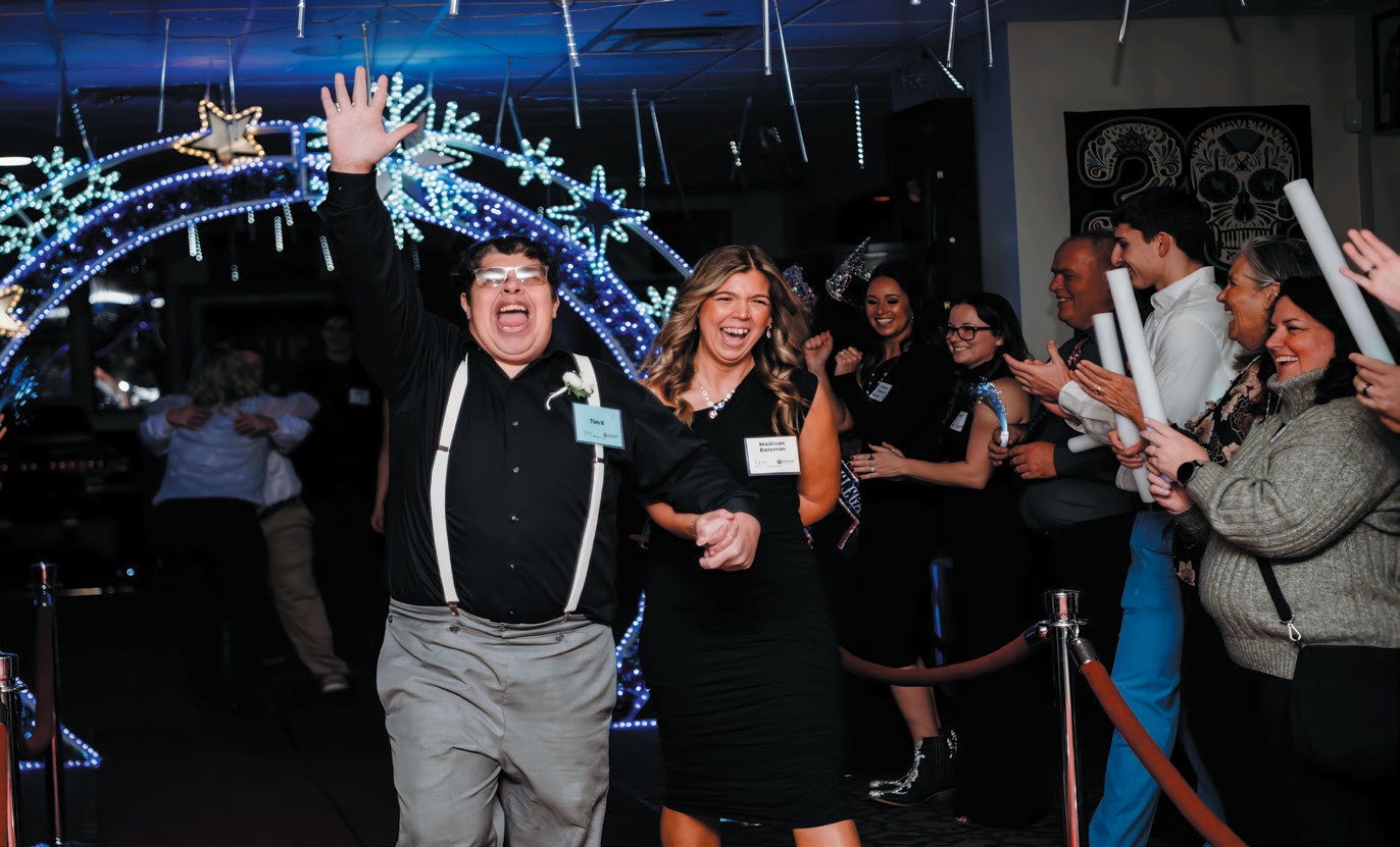 Guest Tim Kauffman walks the red carpet with buddy Madison Bateman as guests cheer them on during Night to Shine. The two look forward to being paired together each year for the special event. Photo Contributed)